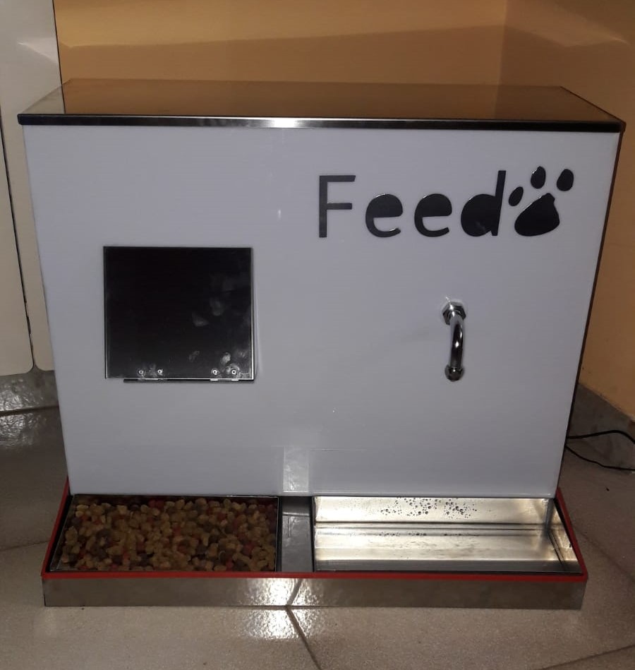 Il nostro prodotto, Feedo, è un distributore automatico di cibo e acqua per animali domestici che, collegato ad un'applicazione per smartphone e tablet, permette al padrone di gestire al meglio il dosaggio dei pasti, e di verificare, tramite un apposito sensore del peso, se il proprio animale ha mangiato o meno.